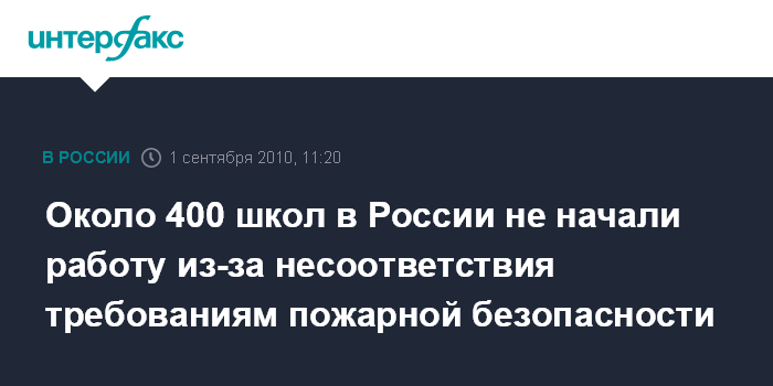 Москва. 1 сентября. ИНТЕРФАКС - Около 400 школ не приступили к работе 1 сентября, так как они не отвечают требованиям пожарной безопасности, заявил глава МЧС России Сергей Шойгу.