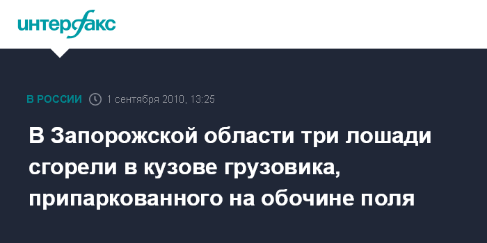 Запорожье. 1 сентября. INTERFAX.RU - В Запорожской области в кузове КамАЗа сгорели три лошади. Пожар возник в Бердянском районе на 593 км автодороги Одесса-Мелитополь-Новоазовск.