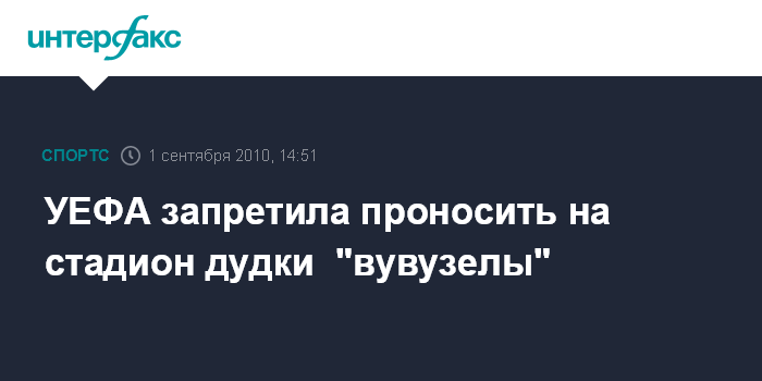 Москва. 1 сентября. INTERFAX.RU – УЕФА запретила проносить на стадион дудки "вувузелы", ставшие известными после чемпионата мира 2010 года в ЮАР.
