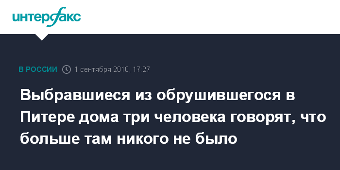 Санкт-Петербург. 1 сентября. INTERAFX.RU - Из обрушившегося в Петербурге здания выбрались три человека, они утверждают, что были единственными в здании.