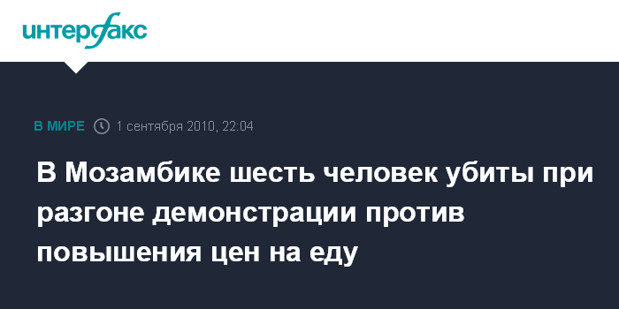 Вашингтон. 1 сентября. INTERFAX.RU - Полиция открыла огонь по демонстрантам, вышедшим на улицы столицы Мозамбика Мапуту в знак протеста против повышения цен на еду, шесть человек были убиты, более 20 человек получили ранения, сообщают в среду американские СМИ.