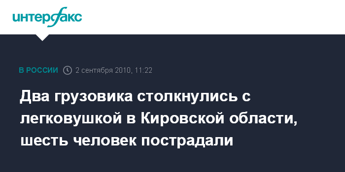 Киров. 2 сентября. INTERFAX.RU - В ДТП с участием двух грузовиков и легкового автомобиля в Белохолуницком районе Кировской области пострадали шесть человек.