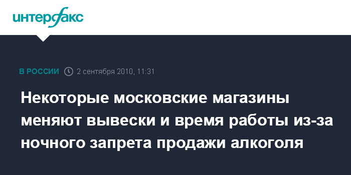 2 сентября. INTERFAX.RU - Введенный с 1 сентября в Москве запрет на продажу алкоголя с долей этилового спирта свыше 15% с 22:00 до 10:00 привел к изменениям в работе ряда магазинов.