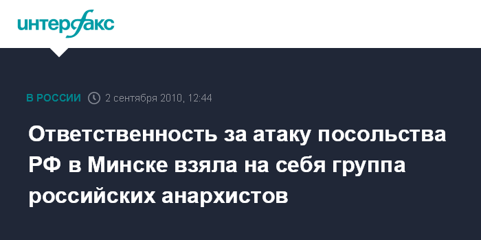 Минск. 2 сентября. INTERFAX.RU - Ответственность за атаку посольства РФ в Минске "коктейлями Молотова" взяла на себя группа российских анархистов, которые называют себя "Друзья свободы".