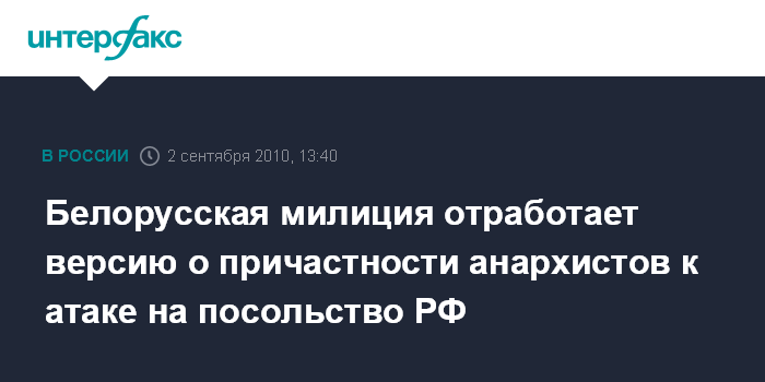 Минск. 2 сентября. INTERFAX.RU - Следствие будет отрабатывать в числе других версию о причастности группы анархистов к инциденту на территории российского посольства в Минске, сообщили в ГУВД Мингорисполкома.
