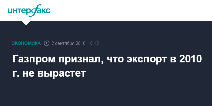 Москва. 2 сентября. INTERFAX.RU - "Газпром" (РТС: GAZP) признал, что экспорт газа в дальнее зарубежье в 2010 г. не вырастет, несмотря на восстановление европейской экономики.