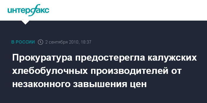 Москва. 2 сентября. INTERFAX.RU – Прокуратура предостерегла ряд калужских хлебобулочных производителей от незаконного завышения цен на продукцию.