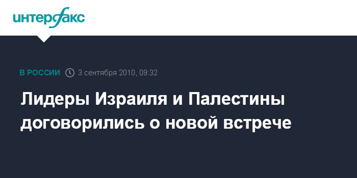 Вашингтон. 3 сентября. INTERFAX.RU - Премьер Израиля Биньямин Нетаньяху и глава Палестинской национальной администрации Махмуд Аббаса на прямых переговорах в Вашингтоне достигли договоренности о новой встрече, которая пройдет 14 и 15 сентября на Ближнем Востоке, об этом сообщил спецпосланник США по ближневосточному урегулированию Джордж Митчелл.