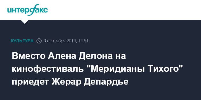 "К сожалению, Ален Делон, который ранее хотел прибыть во Владивосток, уведомил нас, что из-за работы в своем ремейке он не сможет принять участие в кинофестивале. Но зато получили согласие от другой звезды французского кино - Жерара Депардье", - сообщил в пятницу журналистам генеральный директор "Меридианов Тихого" Сергей Пак.
