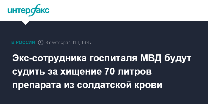 Экс-сотрудника госпиталя МВД будут судить за хищение 70 литров препарата из солдатской крови