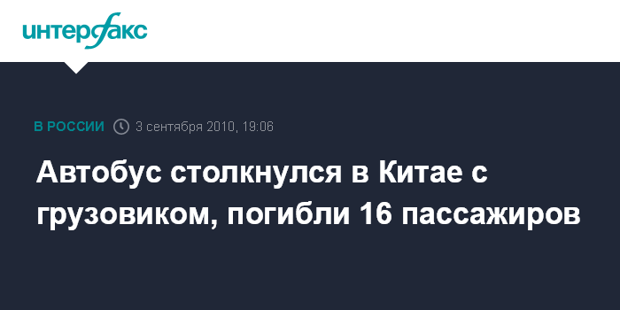 Пекин. 3 сентября. INTERFAX.RU - Не менее 16 человек погибли в результате столкновения пассажирского автобуса с грузовым автомобилем в северо-восточном Китае, сообщили местные СМИ.