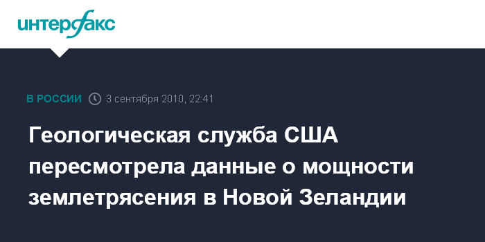 Вашингтон/Лондон. 3 сентября. ИНТЕРФАКС - Геологическая служба США пересмотрела данные о землетрясении в Новой Зеландии, по уточненным данным, землетрясение магнитудой 7,2 произошло в 30 км северо-западнее города Крайстчерч. Толчки были зафиксированы на глубине 16,1 км.