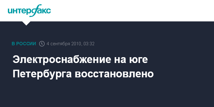 Санкт-Петербург. 4 сентября. ИНТЕРФАКС - СЕВЕРО-ЗАПАД - В Московском районе Петербурга в 2:15 мск восстановлено электроснабжение, сообщили в главном управлении МЧС по северной столице.