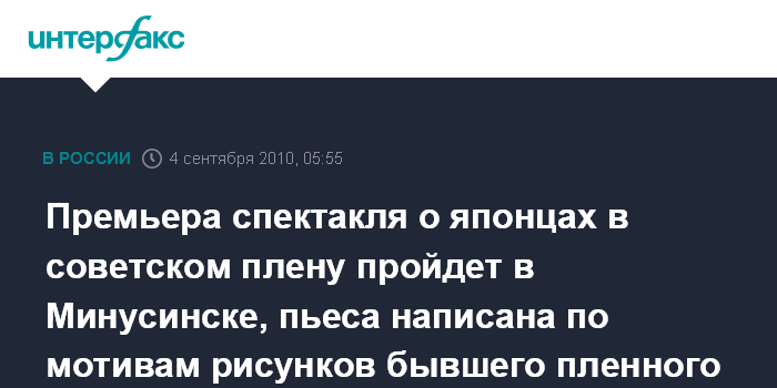 Красноярск. 4 сентября. ИНТЕРФАКС - Спектакль по мотивам рисунков японского солдата, интернированного в СССР после окончания Второй мировой войны, впервые пройдет с участием японских актеров в Минусинском драматическом театре.