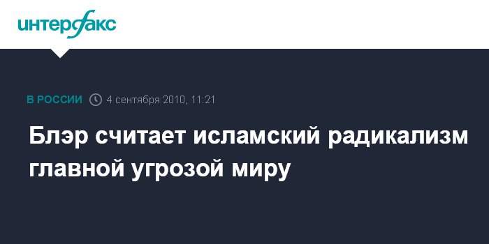 Лондон. 4 сентября. INTERFAX.RU - Бывший премьер-министр Великобритании Тони Блэр в интервью британской телерадиокорпорации Би-би-си назвал исламский радикализм величайшей угрозой в современном мире. Радикальные исламисты считают, что любой способ достижения цели оправдан, включая применение химического, биологического или ядерного оружия, заявил Т.Блэр в интервью британским журналистам. Вместе с тем бывший премьер-министр, при котором Великобритания присоединилась к войнам в Афганистане и Ираке, отверг предположения о том, что его собственная политика могла способствовать росту исламского радикализма.