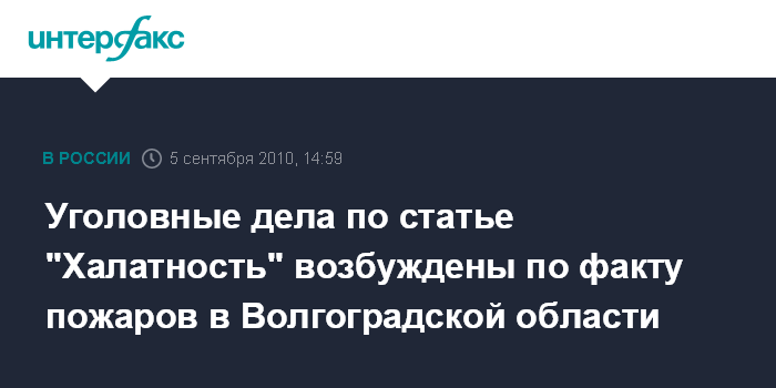 Волгоград. 5 сентября. INTERFAX.RU - В Волгоградской области возбуждены уголовные дела по фактам пожаров в Жирновском и Котовском районах региона, сообщили агентству "Интерфакс-Юг" в СУ СКП РФ по Волгоградской области. "Уголовные дела возбуждены межрайонными следственными отделами СУ СКП РФ по региону по итогам процессуальных проверок по статье 293 УК РФ (халатность, повлекшая смерть двух и более лиц) в Жирновском и Котовском районах", - сказал собеседник агентства.