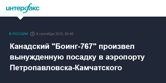 Петропавловск-Камчатский. 6 сентября. ИНТЕРФАКС-ДАЛЬНИЙ ВОСТОК - Самолет "Боинг-767" авиакомпании "Эйр Канада", на борту которого находились 162 человека, совершил вынужденную посадку в аэропорту Петропавловска-Камчатского из-за подозрения, что на борту лайнера начался пожар.