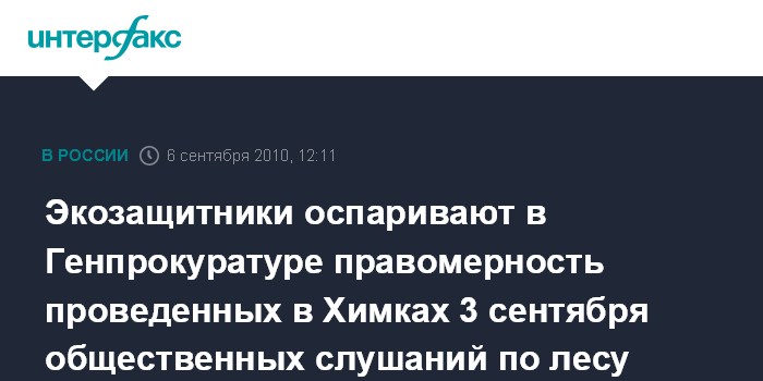 Москва. 6 сентября. INTERFAX.RU - Экозащитники направили заявление в Генпрокуратуру РФ с требованием устранить нарушения закона, допущенные при проведении в Химках дополнительных общественных слушаний.