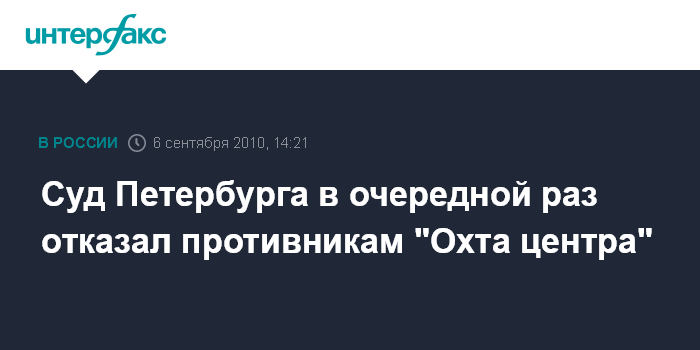 Санкт-Петербург. 6 сентября. INTERFAX.RU - Городской суд Петербурга подтвердил законность решения властей города, изменивших границы объекта культурного наследия "Ниеншанц", на месте которого панируется строительство "Охта центра".