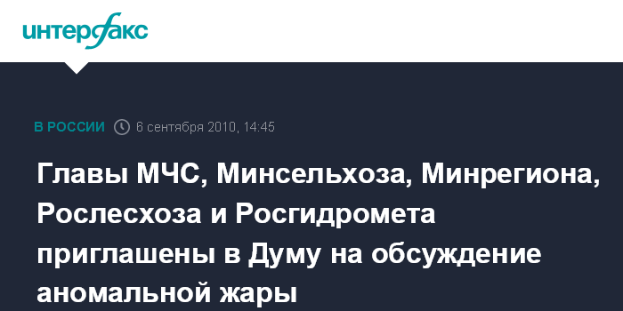 Главы МЧС, Минсельхоза, Минрегиона, Рослесхоза и Росгидромета приглашены в Думу на обсуждение аномальной жары