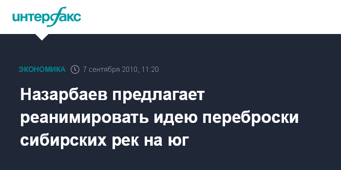 "Обсуждали сегодня и вчера: вспомнить проект переброски вод сибирских рек в южные регионы России и Казахстан. В перспективе, Дмитрий Анатольевич (Медведев), эта проблема может оказаться очень большой, необходимой для обеспечения питьевой водой всего Центрально-Азиатского региона", - сказал Назарбаев во вторник на форуме приграничного сотрудничества между Казахстаном и Россией в Усть-Каменогорске.