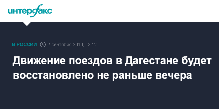 Махачкала. 7 сентября. INTERFAX.RU - Движение поездов на ветке Кизляр - Уланхол, прерванное из-за подрыва грузового состава, по предварительным данным, будет открыто не раньше вечера вторника, сообщил "Интерфаксу" замначальника линейного управления внутренних дел на транспорте республики Артур Гасанов.