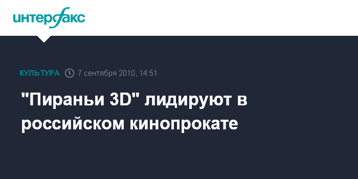 Москва. 7 сентября. INTERFAX.RU - По предварительным данным о сборах фильмов в российском кинопрокате за прошедший уикенд (3-5 сентября) лидером является фильм "Пираньи 3D" студии Atmosphere Entertainment MM LLC, собравший $ 2 077 922.