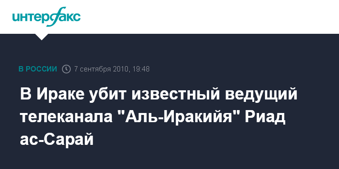 Лондон. 7 сентября. INTERFAX.RU - Популярный ведущий иракского телеканала "Аль-Иракийя" Риад ас-Сарай был убит неизвестными в Багдаде, сообщила во вторник британская телерадиокорпорация BBC со ссылкой на представителей международной общественной организации "Репортеры без границ".