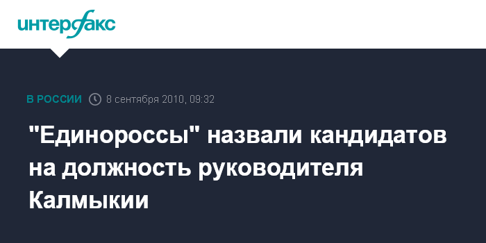 Москва. 8 сентября. INTERFAX.RU - "Единая Россия" предложит президенту РФ Дмитрию Медведеву четыре кандидатуры на пост главы Калмыкии.