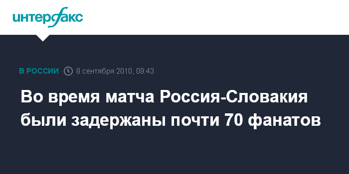 Москва. 8 сентября. ИНТЕРФАКС-МОСКВА - Во время отборочного футбольного матча на чемпионат Европы между сборными Словакии и России были задержаны 67 человек, сообщили "Интерфаксу" в управлении информации столичного ГУВД.