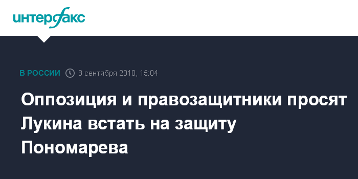 Москва. 8 сентября. INTERFAX.RU - Лидеры оппозиционного движения "Солидарность" Борис Немцов и Гарри Каспаров, а также глава Московской Хельсинкской группы Людмила Алексеева просят уполномоченного по правам человека в РФ Владимира Лукина отреагировать на арест правозащитника Льва Пономарева за проведение публичной акции в Москве.