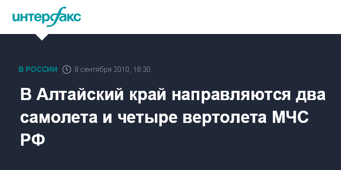"Из Красноярска в Алтайский край вылетел самолет Бе-200 МЧС России, также готовится к вылету с подмосковного аэродрома "Раменский" самолет Ил-76, которые будут принимать участие в тушении лесного пожара. Туда же направляются четыре вертолета - два Ми-8 и два Ми-26", - сообщила "Интерфаксу" начальник управления информации МЧС РФ Ирина Андрианова.
