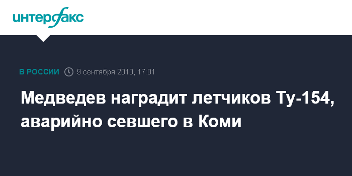 Москва. 9 сентября. INTERFAX.RU - Президент России Дмитрий Медведев заявил о намерении наградить летчиков самолета Ту-154, который совершил вынужденную аварийную посадку на заброшенном военном аэродроме Ижма в Коми.