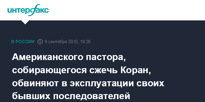 Лондон/Вашингтон. 9 сентября. INTERFAX.RU - Пастор Терри Джонс из американского города Гейнсвилл (штат Флорида), собирающийся сжечь 200 экземпляров Корана 11 сентября, обвиняется своими бывшими последователями в эксплуатации их труда.