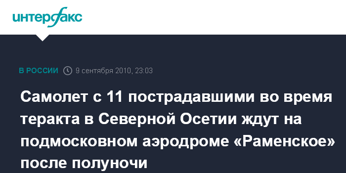 Самолет с 11 пострадавшими во время теракта в Северной Осетии ждут на подмосковном аэродроме «Раменское» после полуночи