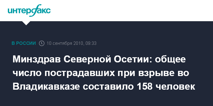 Москва. 10 сентября. INTERFAX.RU - По уточненным данным, 158 человек пострадали в результате теракта на центральном рынке Владикавказа в четверг.