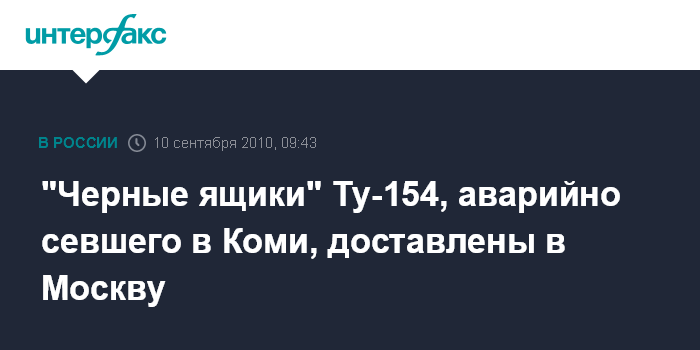 Москва. 10 сентября. INTERFAX.RU - Бортовые параметрические и разговорные самописцы самолета Ту-154, аварийно севшего в Ижме (Республика Коми), доставлены в Москву, сообщили "Интерфаксу" в четверг в Росавиации.