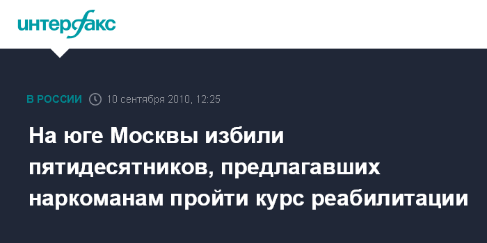 Москва. 10 сентября. INTERFAX.RU - Представители общины пятидесятников заявляют, что подверглись нападению возле рынка у станции метро "Пражская" в Москве, где раздавали визитки с координатами реабилитационных центров для наркоманов.