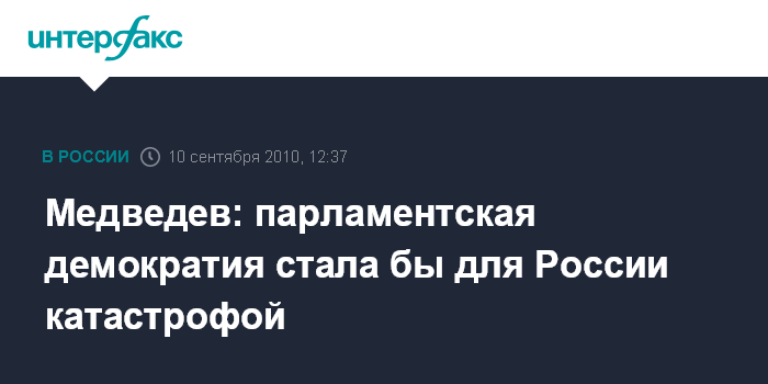 Москва. 10 сентября. INTERFAX.RU - Президент Дмитрий Медведев заявил о неприемлемости для России парламентской демократии как формы правления.