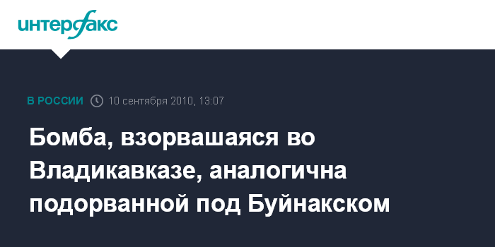 Москва. 10 сентября. INTERFAX.RU - Взрывное устройство, сработавшее возле центрального рынка во Владикавказе 9 сентября, по конструкции и содержимому было аналогично бомбе в автомобиле, протаранившем КПП 136-й мотострелковой бригады на полигоне в районе дагестанского города Буйнакск 5 сентября, сообщил "Интерфаксу" в пятницу источник в силовых структурах Северо-Кавказского федерального округа.