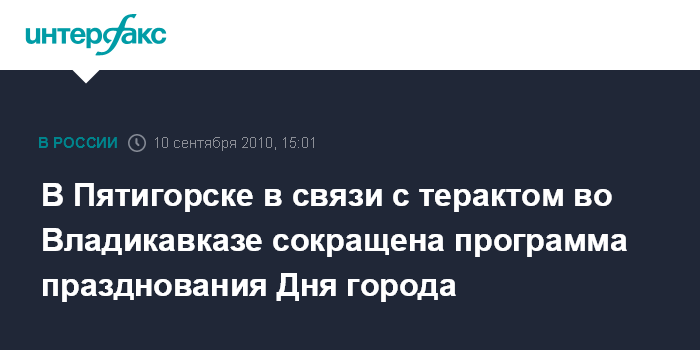 Москва. 10 сентября. INTERFAX.RU - В Пятигорске (Ставропольский край) в связи с трауром в Северной Осетии отменен ряд торжественных мероприятий, посвященных 230-летию города, сообщил руководитель администрации Пятигорска Олег Бондаренко.