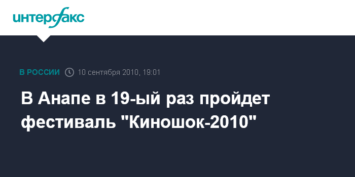 Краснодар. 10 сентября. ИНТЕРФАКС-ЮГ - XIX Открытый фестиваль кино стран СНГ, Латвии, Литвы и Эстонии "Киношок-2010" будет традиционно проходить в Анапе (Краснодарский край) с 12 по 19 сентября.