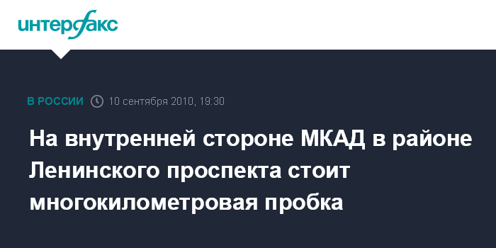 Москва. 10 сентября. INTERFAX.RU - Многокилометровая пробка образовалась вечером в пятницу на внутренней стороне МКАД, начиная от Ленинского проспекта.