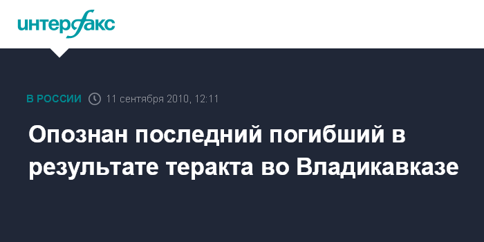 Владикавказ. 11 сентября. INTERFAX.RU - В республиканском бюро судмедэкспертизы Северной Осетии во Владикавказе опознан труп 51-летнего мужчины, погибшего во время теракта 9 сентября, сообщили агентству "Интерфакс-Юг" по телефону горячей линии, организованной в городской мэрии. "Эти дни в морге находился труп мужчины, которого минувшей ночью опознали родственники и к настоящему времени уже забрали", - сказал собеседник агентства.