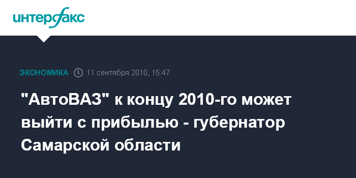Ново-Огарево. 11 сентября. INTERFAX.RU - "АвтоВАЗ" в этом году намерен выпустить 580 тыс. автомобилей и к концу года выйти с прибылью, заявил губернатор Самарской области Владимир Артяков. В ходе встречи с премьер-министром РФ Владимиром Путиным В.Артяков сообщил, что в текущем году компания намерена выпустить 580 тыс. автомобилей по сравнению с 320 тыс. машин в 2009 году. "Сегодня мы можем говорить, что "АвтоВАЗ" к концу 2010 года может выйти с прибылью", - сказал губернатор.