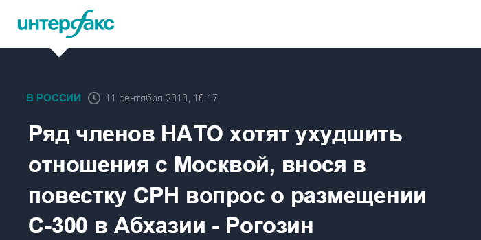 Брюссель. 11 сентября. INTERFAX.RU - Постпред России при НАТО Дмитрий Рогозин считает спекулятивными попытки ряда новых членов альянса инициировать на заседании Совета Россия-НАТО (СРН) 15 сентября вопрос о размещении Россией в Абхазии зенитных ракетных систем С-300.