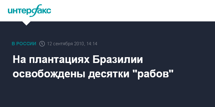 Лондон. 12 сентября. INTERFAX.RU - Власти Бразилии заявляют, что в ходе специального рейда в юго-восточных провинциях страны представители правопорядка освободили 95 рабочих ферм и плантаций, которых хозяева содержали практически в рабских условиях, сообщила в воскресенье британская телерадиовещательная корпорация Би-би-си. "44 работника плантации сахарного тростника в штате Рио-де-Жанейро вообще не были зарегистрированы ни в одной инстанции. Они выходили на работу без необходимого по правилам техники безопасности снаряжения, а жили в бараках, без питьевой воды. Еще 51 человек обнаружен в подобных условиях на клубничной ферме в провинции Минас-Жерайс. Всем им будет выплачена компенсация", - говорится в сообщении.