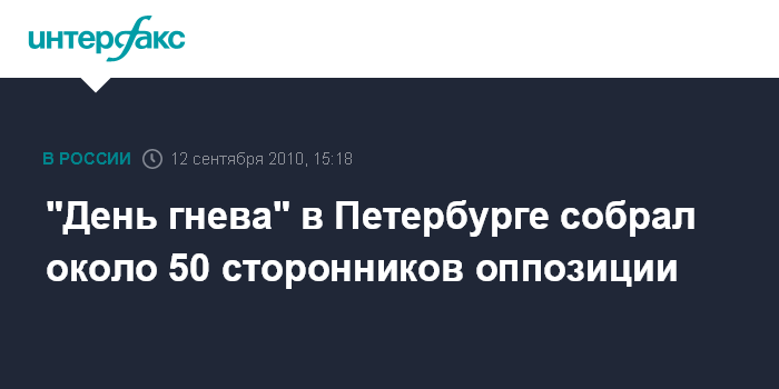 Санкт-Петербург. 12 сентября. INTERFAX.RU - Петербургские оппозиционеры в воскресенье провели митинг в рамках так называемого "Дня гнева". Одна из организаторов акции Тамара Ведерникова сообщила "Интерфаксу", что участники митинга потребовали отставки городских властей, пересмотра градостроительной политики, а также социализации бюджетной сферы. По ее словам, в акции приняли участие около 50 человек. Митинг прошел без столкновений с милицией, абсолютно мирно, в рамках закона.