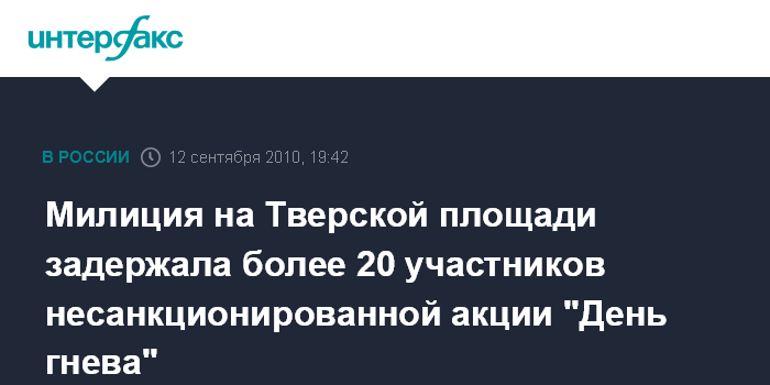Москва. 12 сентября. ИНТЕРФАКС - Московская милиция вечером в воскресенье задержала более 20 человек за участие несанкционированной акции "День гнева" на Тверской площади, сообщил "Интерфаксу" источник в правоохранительных органах.