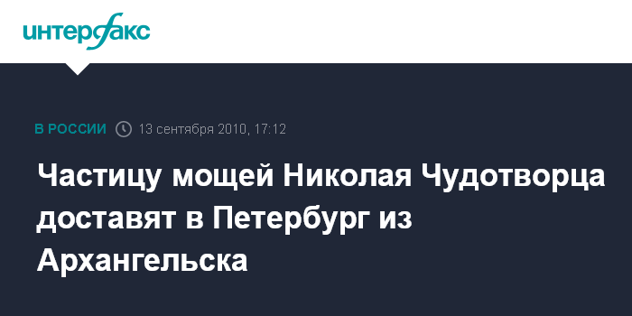 Санкт-Петербург. 13 сентября. INTERFAX.RU - Ковчег с частицей мощей Николая Чудотворца (Мирликийского) будет доставлен в Петербург из Архангельска во вторник, сообщили "Интерфаксу" в храме преподобного Антония Сийского.